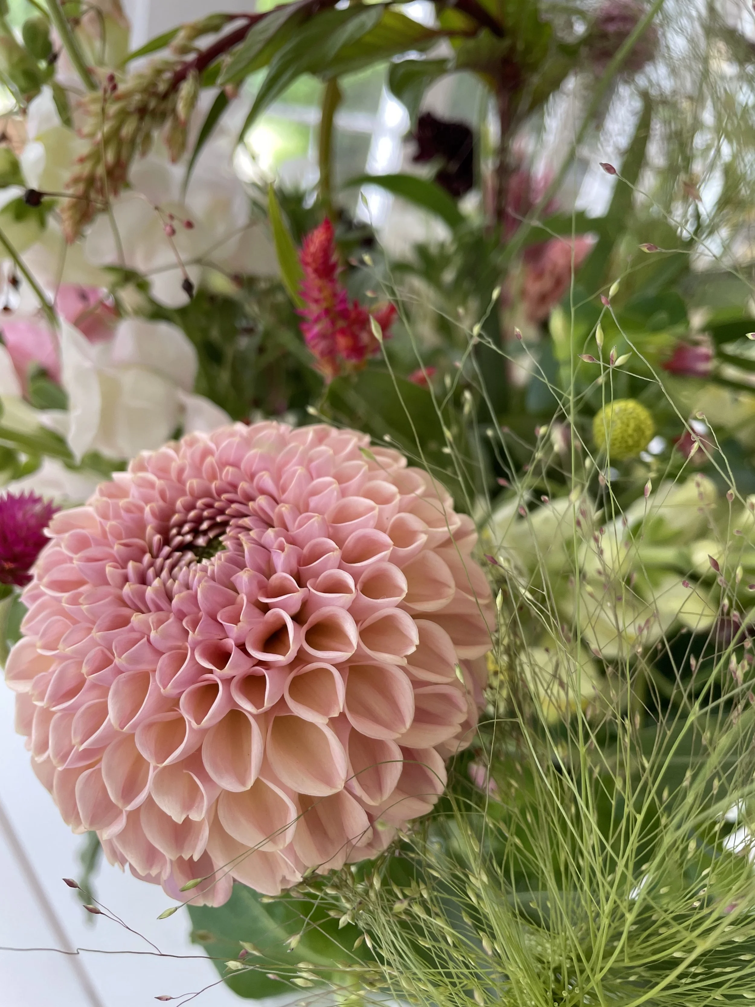 This is totally dependent on what time of year your event is and what is thriving in the fields. We cannot guarantee any varieties. Flowers we typically grow include zinnias, sunflowers, and cosmos, supporting flowers like dara, scabiosa, gomphrena, and celosia and foliage like basil, bee balm, and anise hyssop.